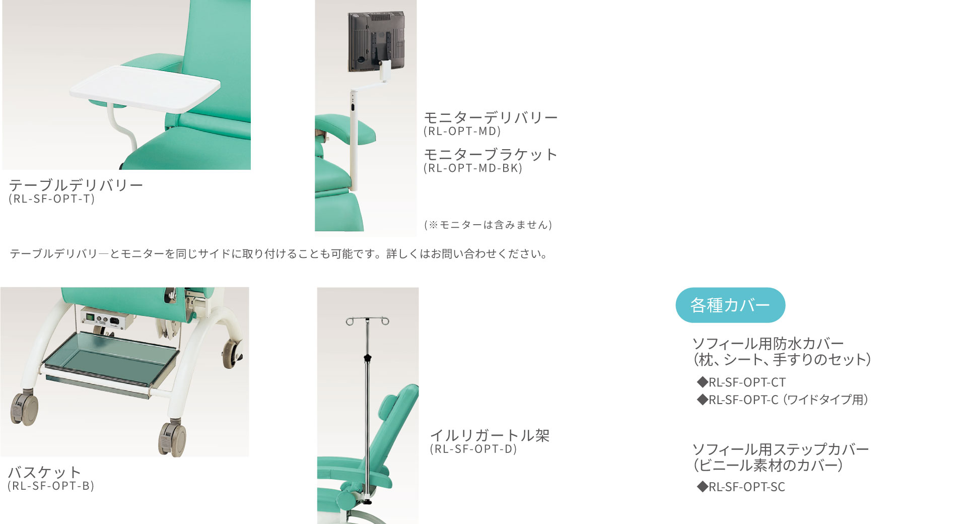 | [オプション] | テーブルデリバリー、モニターデリバリー/モニターブラケット、バスケット、イルリガートル架、防水ストレッチカバー、ステップカバー |