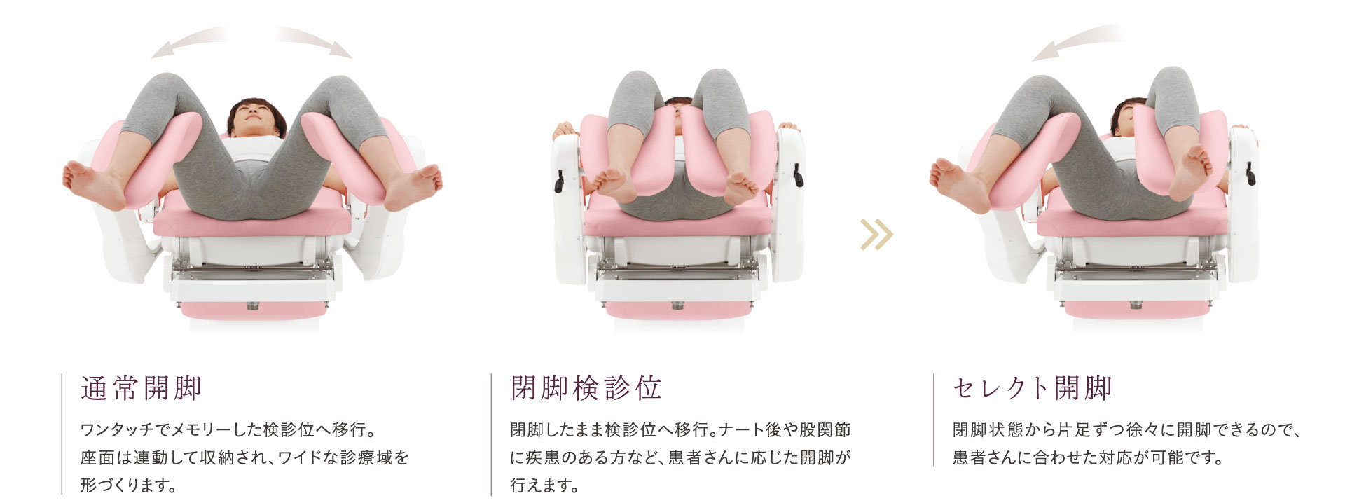 外来検診から処置・不妊治療まで、幅広いシーンで使用可能。ワンタッチで容易にフラットポジションへ移行でき、ストレッチャー移載時や処置後の安静時などにもスムースに対応できます。