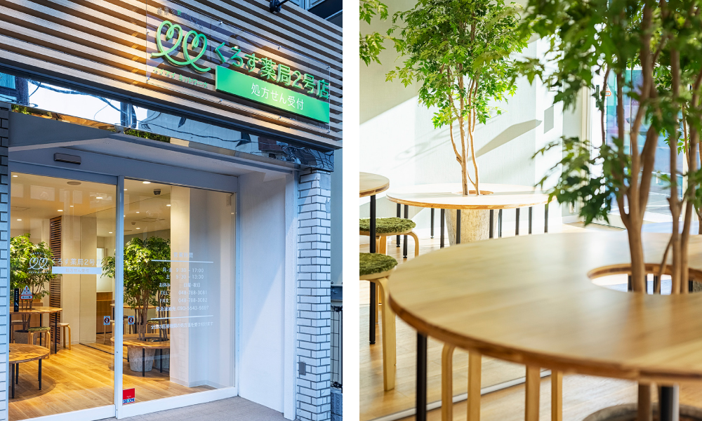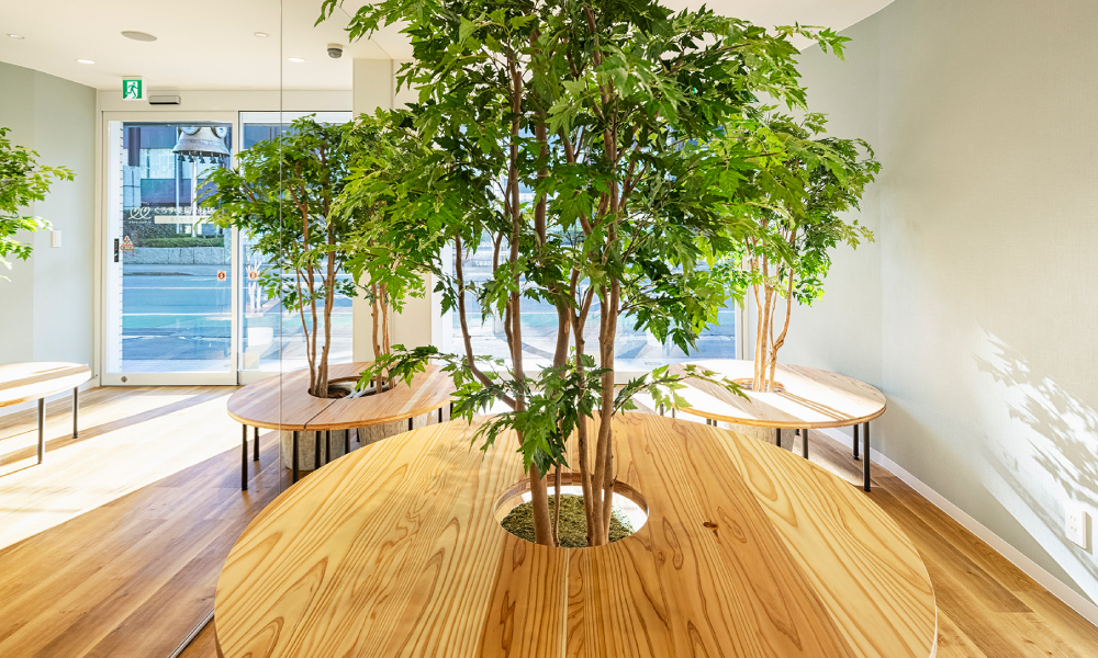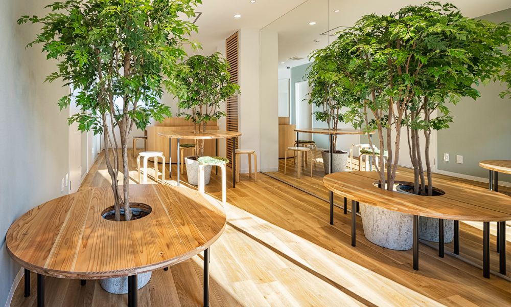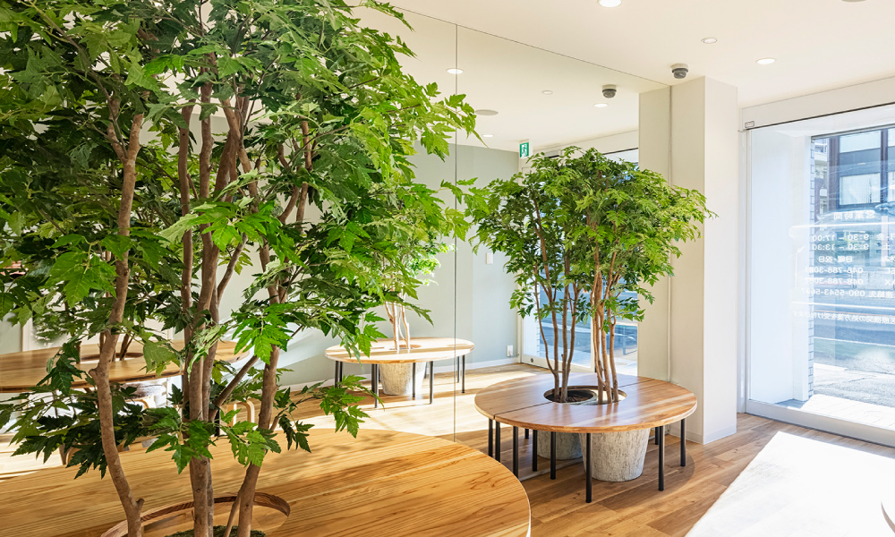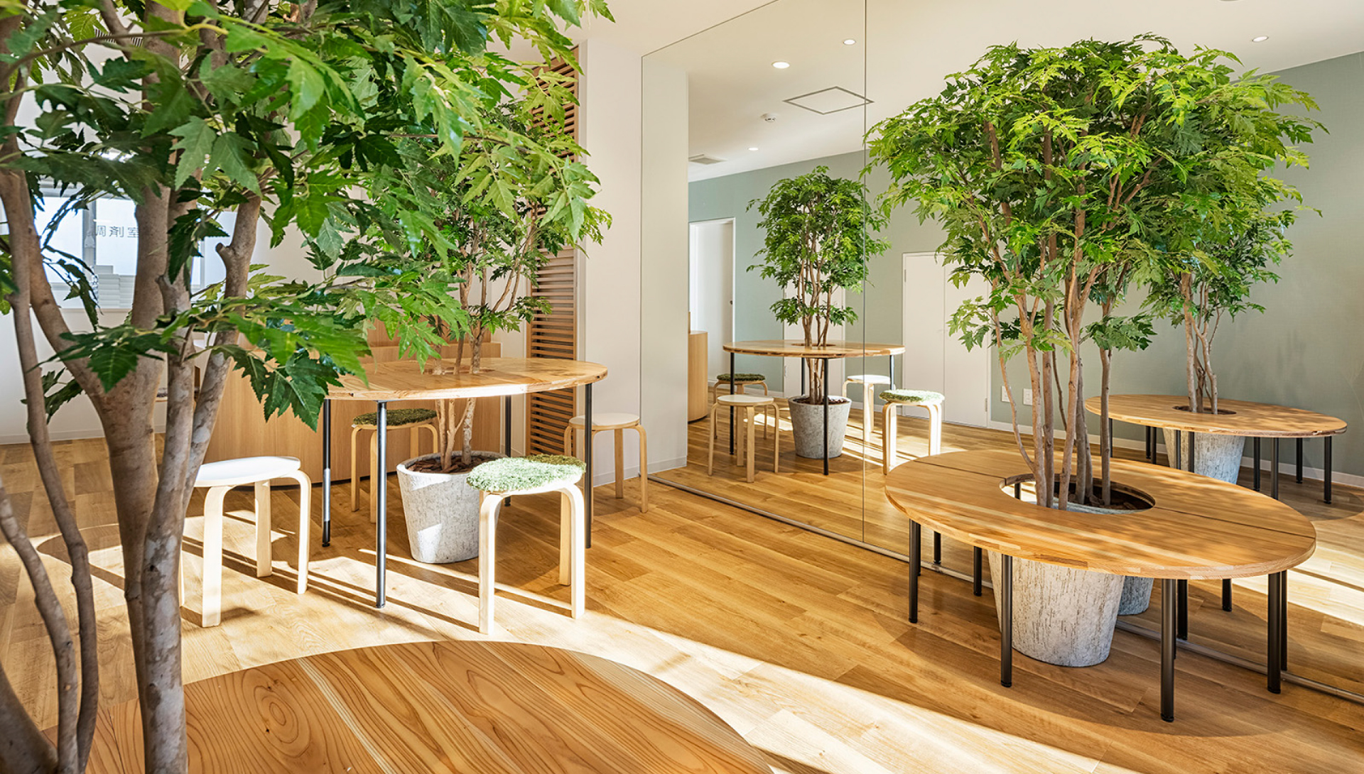 間口が狭く奥行きの長いうなぎの寝床状空間を、イメージを変えつつ各機能を割り振る中で考えたのは、高低差のある円形ベンチやテーブルを配置し、中心に穴を開けて人工樹木を挟み込み、脚をつけてランダムに配置、その上で空間に広がりと開放感を持たせるために入って右側の壁面を全面鏡にすることで映り込みを利用して空間が倍増するように考えた。