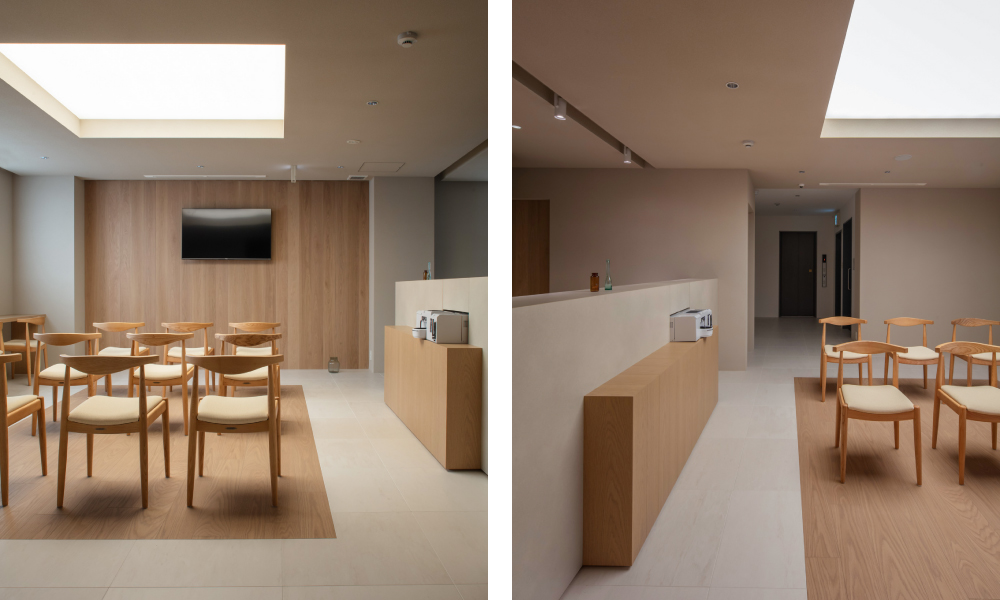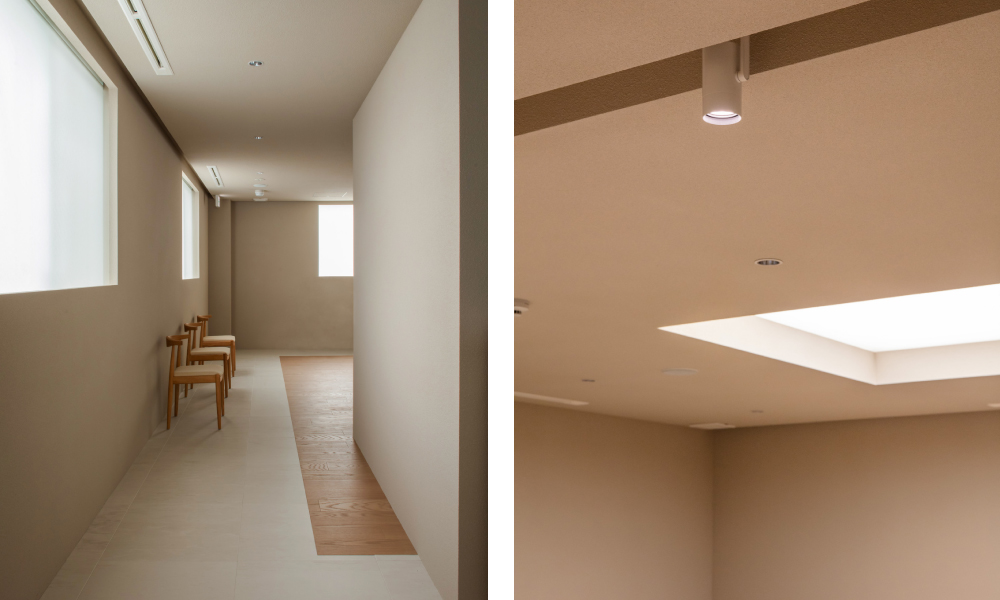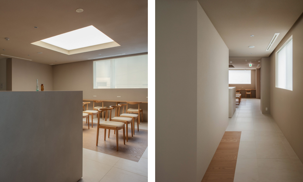 天井を一部発光面とし、天井の低さを軽減すると共に、窓についてはサッシといったノイズを消しながら自然光を取り込んでいる。