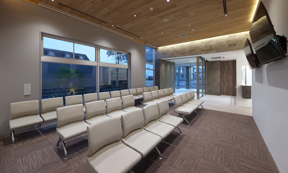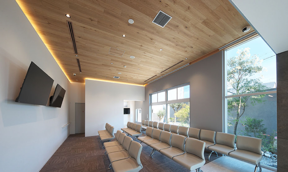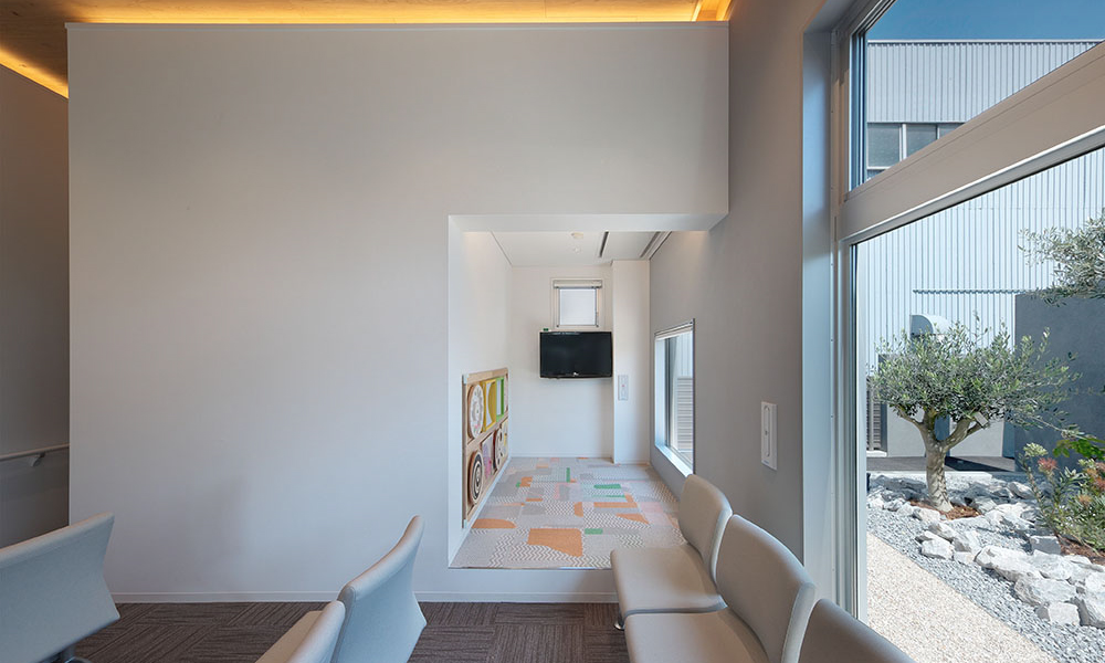 内観は、2階建部分のボリュームが中へと繋がる構成とし、空間それぞれの天井高さに変化を付けた。天井の高い待合空間は、広い開口部と中庭からの外光によって、明るく開放的な空間に。