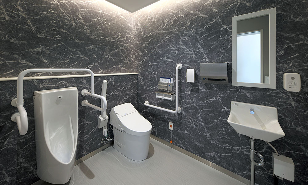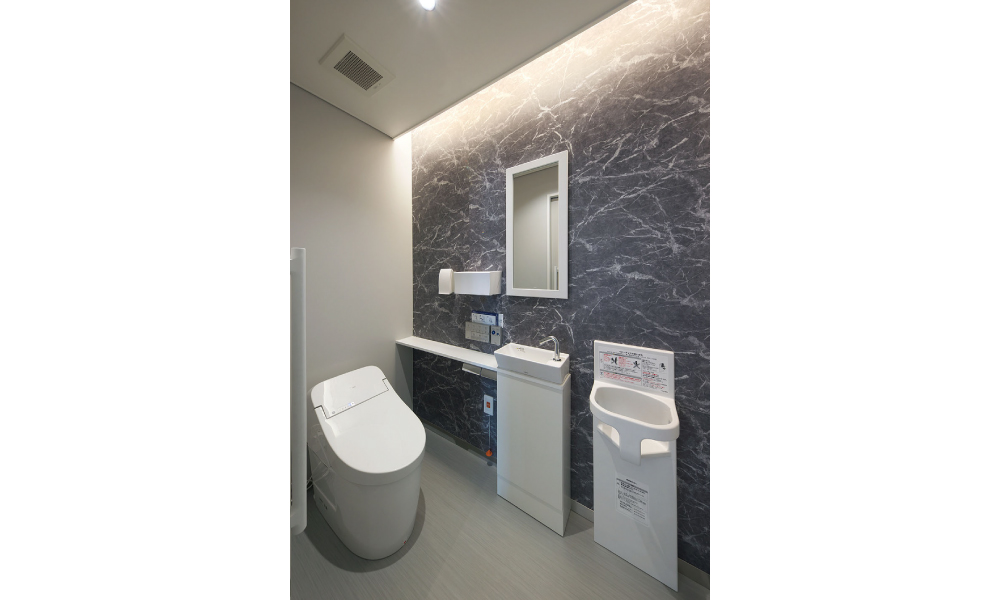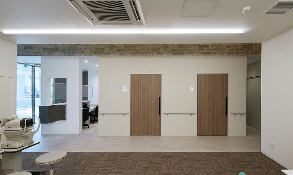 また、天井の高い部分には、間接照明をあしらい、天井面に視線を誘導。木目の天井に目を向けさせ、温もりのある空間を感じてもらう。間接照明は、診療に向かう患者の動線に沿って配置しており、奥へと患者を誘導する。診療スペースの突き当たりには、天井まで鏡面素材を用い、繋がりと奥行き感を強調。奥へと進む期待感を膨らませる。
