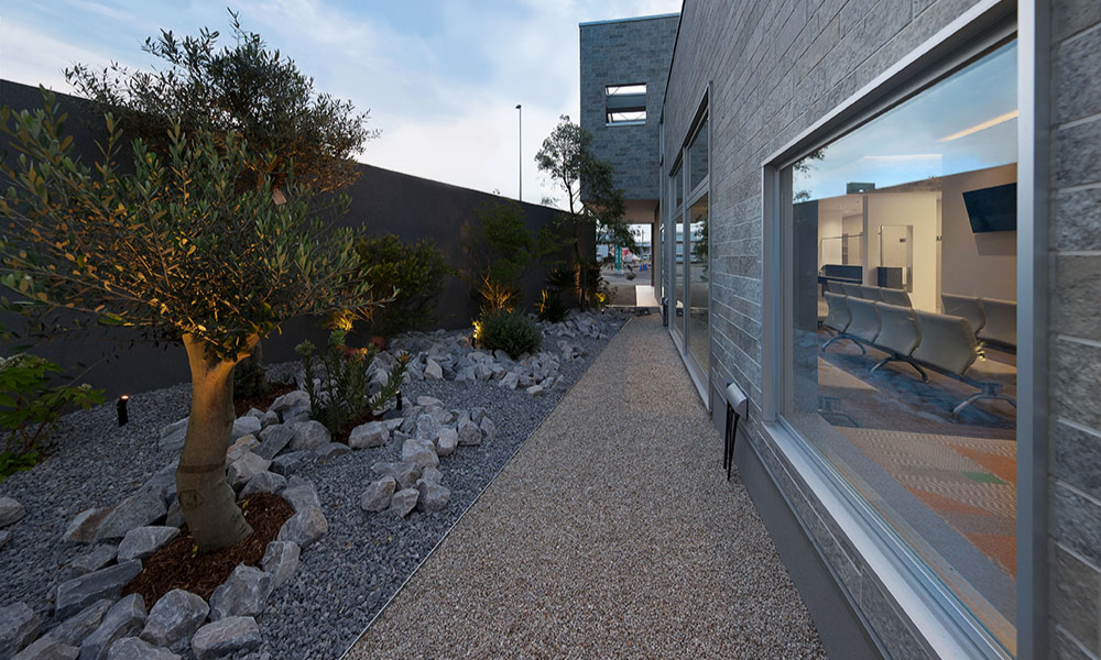 また、車の往来しか見られないような場所のため、あえて幹線道路側は、視覚的に外部環境と遮断するように擁壁を立てた。擁壁の裏側には、中庭を配置し、医院内から自然を感じられる計画に。中に入ると、外の光景や雑音が遮断され、静かで穏やかな雰囲気に包まれる。